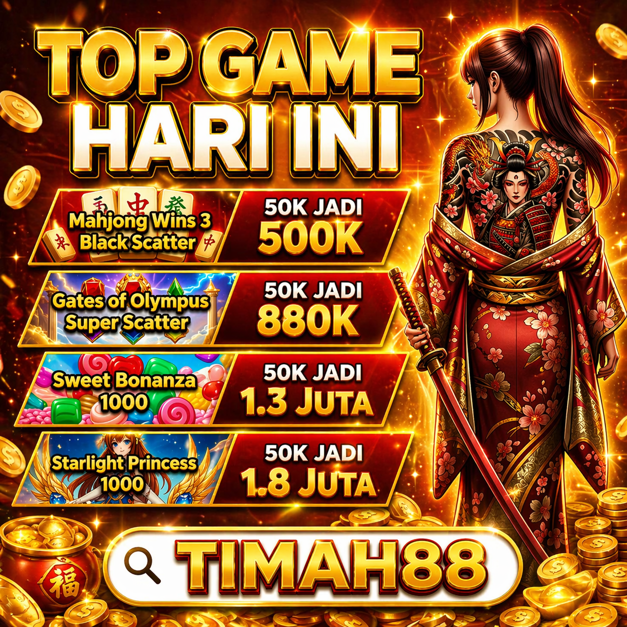 Buat kamu yang ingin cari cuan dari slot gacor, TIMAH88 adalah pilihan tepat. Dengan hanya modal 50K, kamu sudah punya peluang untuk mengubahnya menjadi ratusan ribu bahkan jutaan rupiah. Game seperti Mahjong Wins 3 hadir dengan fitur Black Scatter yang terkenal mudah memberikan kemenangan hingga 500K. Selain itu, Gates of Olympus dengan Super Scatter juga menjadi favorit para pemain karena peluang menangnya yang tinggi hingga 880K hanya dari modal kecil.